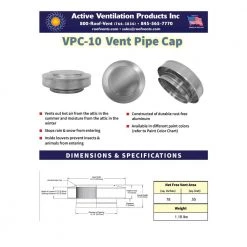 The Vent Cap covers metal pipes extending through the roof. AVP’s Vent Pipe Cap is constructed of durable, rust-free aluminum. These vent caps are not open to the sky, so they keep out rain, snow and debris. Not designed for PVC pipes.
