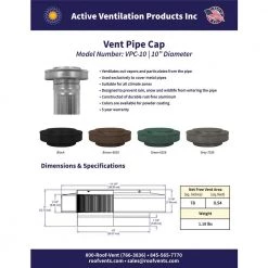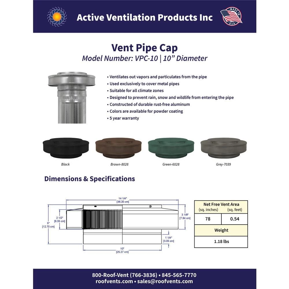 The Vent Cap covers metal pipes extending through the roof. AVP’s Vent Pipe Cap is constructed of durable, rust-free aluminum. These vent caps are not open to the sky, so they keep out rain, snow and debris. Not designed for PVC pipes.