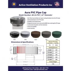 The Aura PVC Vent Cap Model AV-10-PVC is the perfect solution to exhaust and cap a 10 in. Sch. 40 or 80 PVC Pipe. Used for commercial and residential applications, the Aura PVC Vent Cap has an aluminum 1-piece spun lid that prevents rain and snow from entering the PVC pipe verses the turbine vent which is open to the sky and allows rain water to enter in “no wind” conditions. The Aura PVC Vent Cap has a patented, engineered design that continually exhausts air with no moving parts. The vertical louvers in its inner cylinder keeps insects, birds and animals from entering the PVC pipe, allowing optimal air flow and no maintenance. Manufactured 1-piece spun adapter is sized to fit over the straight end of the PVC pipe for an easy and fast installation. Model AV-10-PVC has a mill finish that will continually have a long lasting clean appearance. Made of durable and rust free aluminum, the Aura PVC Vent Cap’s round aerodynamic design can with stand harsh weather and wind forces of up to 200 MPH.