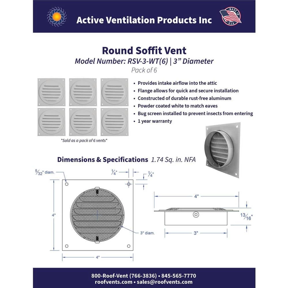 The 3 in. round soffit vent 6-pack is an easy-to-install option for intake airflow. These mini louvers will provide critical intake ventilation in hard-to-ventilate or restricted areas. The flange of the vent allows for an easy and secure installation without the risk of falling out. While on the other hand, most other mini louvers fall out over time. Soffit vents control moisture and rotting problems common to eave and overhang areas by providing needed intake airflow for exhaust vents. In addition, they also help provide proper temperature balance and energy performance. The 3 in. round soffit vent is constructed of durable, corrosion-resistant aluminum and is powder-coated white. Additionally, each mini louver has a screen inside to prevent insects from entering. When paired with proper exhaust ventilation, the round soffit vent will allow for optimal airflow.