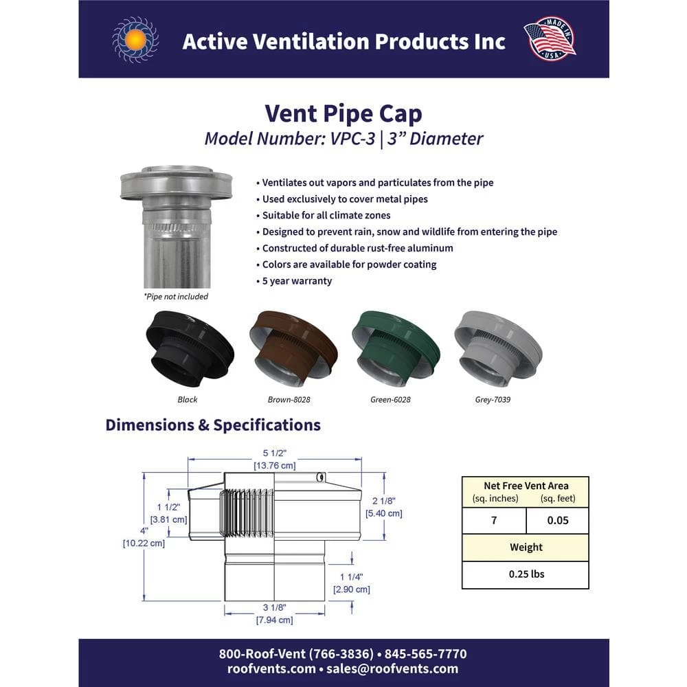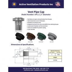 The Vent Cap covers metal pipes extending through the roof. AVP’s Vent Pipe Cap is constructed of durable, rust-free aluminum. These vent caps are not open to the sky, so they keep out rain, snow and debris. Not designed for PVC pipes.