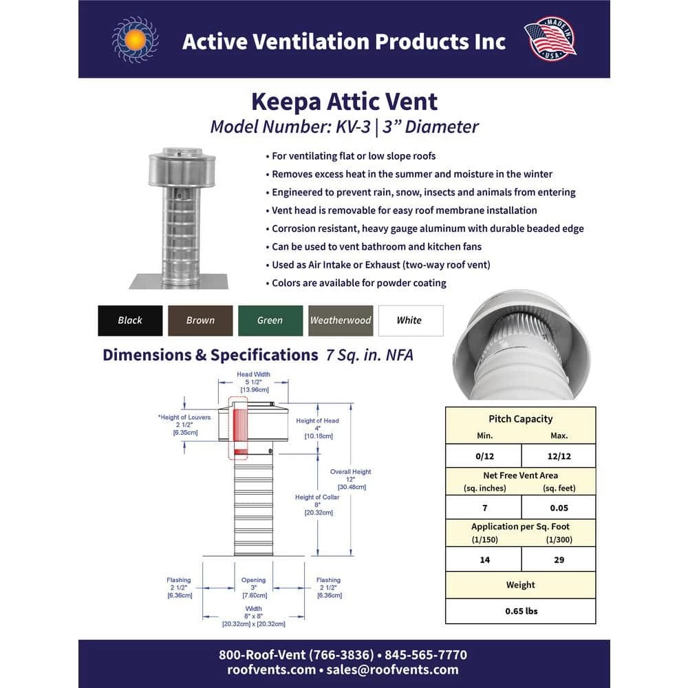 Active Ventilation Products Keepa Vent will alleviate moisture in the winter and heat in the summer to extend the life of the roof and building structure. The Keepa Vent is best used for flat roof attic spaces as an exhaust roof vent or fresh air supply intake roof vent. Made of corrosion resistant aluminum, the Keepa Vent has a round concentric vent cap and 7 in. collar height, square flange and an inner louver wildlife guard. The vent cap is a manufactured 1-piece spun round aluminum cap that prevents rain and snow from entering the vent. The vent cap is removable to allow access for an easy rubber boot installation for membrane roofs. The 7 in. collar is great for locations that accumulate high levels of snow falls and the round design is aerodynamic to with stand wind speeds up to 200 mph. The Keepa Vent has proven to be an excellent and economical choice for a flat roof application.