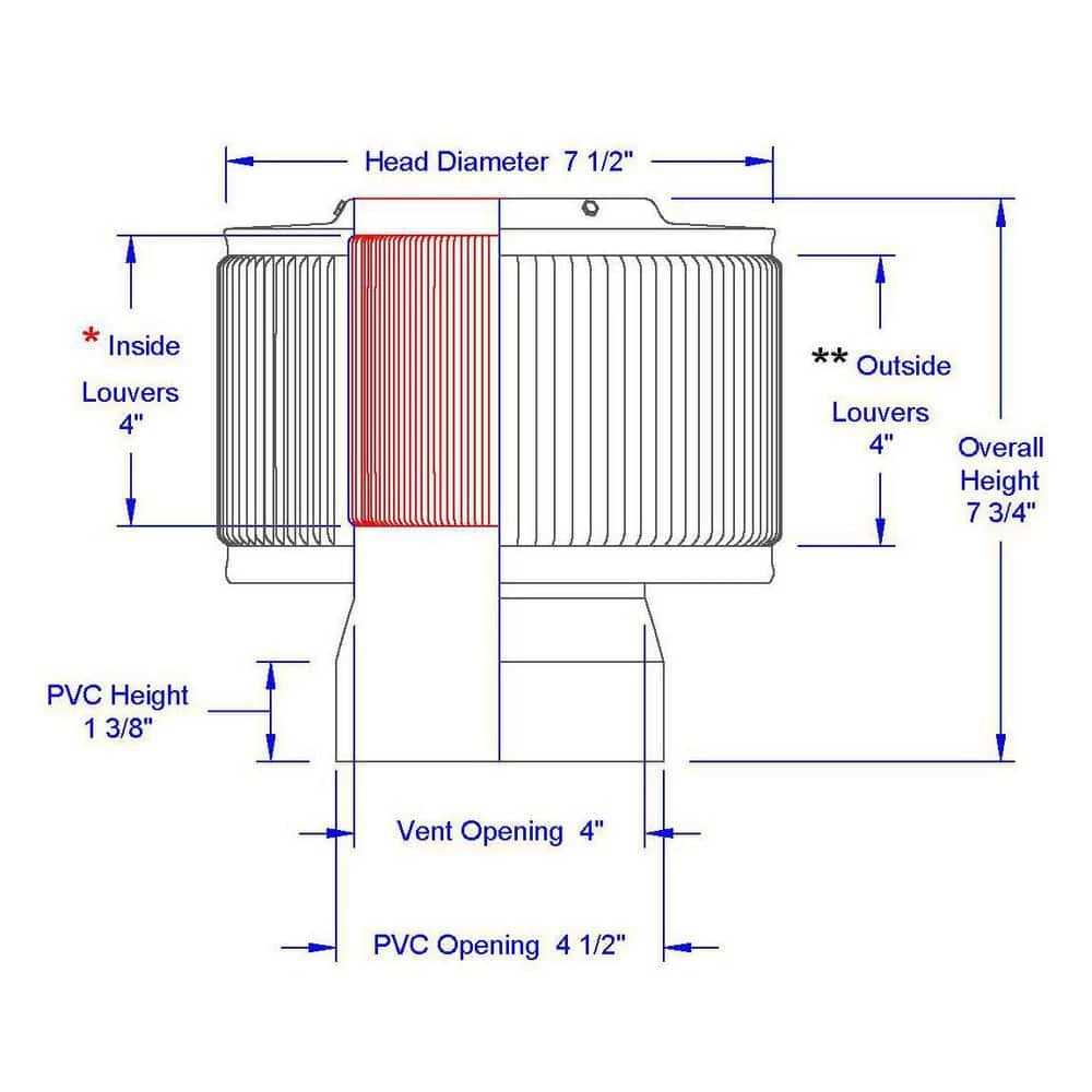 The Aura PVC vent cap model AV-4-PVC is the perfect solution to exhaust and cap a 4 in. Schedule 40 or 80 PVC Pipe. Used for commercial and residential applications, the Aura PVC vent cap has some aluminum 1-piece spun lid that prevents rain and snow from entering the PVC pipe verses the turbine vent which is open to the sky and allows rainwater to enter in “no wind” conditions. The Aura PVC vent cap has a patented, engineered design that continually exhausts air with no moving parts. The vertical louver in its inner cylinder keeps insects, birds, and animals from entering the PVC pipe, allowing optimal air flow and no maintenance. Manufactured 1-piece spun adapter is sized to fit over the straight end of the PVC pipe for an easy and fast installation. Model AV-4-PVC has a mill finish that will continually have a long-lasting clean appearance. Made of durable and rust-free aluminum, the Aura PVC vent cap’s round aerodynamic design can with stand harsh weather and wind forces of up to 200 mph.