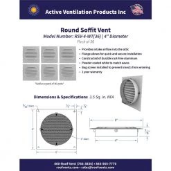 The 4 in. round soffit vent 36-pack is an easy-to-install option for intake airflow. These mini louvers will provide critical intake ventilation in hard-to-ventilate or restricted areas. The flange of the vent allows for an easy and secure installation without the risk of falling out. While on the other hand, most other mini louvers fall out over time. Soffit vents control moisture and rotting problems common to eave and overhang areas by providing needed intake airflow for exhaust vents. In addition, they also help provide proper temperature balance and energy performance. The 4 in. round soffit vent is constructed of durable, corrosion-resistant aluminum and is powder-coated white. Additionally, each mini louver has a screen inside to prevent insects from entering. When paired with proper exhaust ventilation, the round soffit vent will allow for optimal airflow.