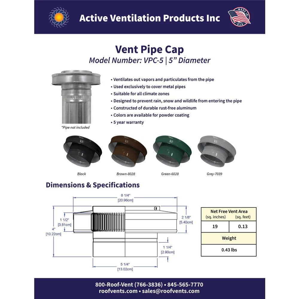 The Vent Cap covers metal pipes extending through the roof. AVP’s Vent Pipe Cap is constructed of durable, rust-free aluminum. These vent caps are not open to the sky, so they keep out rain, snow and debris. Not designed for PVC pipes.