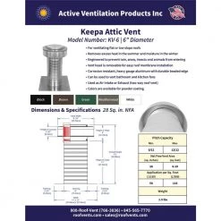 Active Ventilation Products Keepa vent will alleviate moisture in the winter and heat in the summer to extend the life of the roof and building structure. The Keepa vent is best used for flat roof attic spaces as an exhaust roof vent or fresh air supply intake roof vent. Made of corrosion resistant aluminum, the Keepa vent has a round concentric vent cap and standard 11 in. collar height, square flange and an inner louver wildlife guard. The vent cap is a manufactured one piece spun round aluminum cap that prevents rain and snow from entering the vent. The vent cap is removable to allow access for an easy rubber boot installation for membrane roofs. The 11 in. standard collar is excellent for locations that accumulate high levels of snow falls and the round design is aerodynamic to with stand wind speeds up to 200 mph. The Keepa vent has proven to be an excellent and economical choice for a flat roof application.