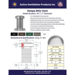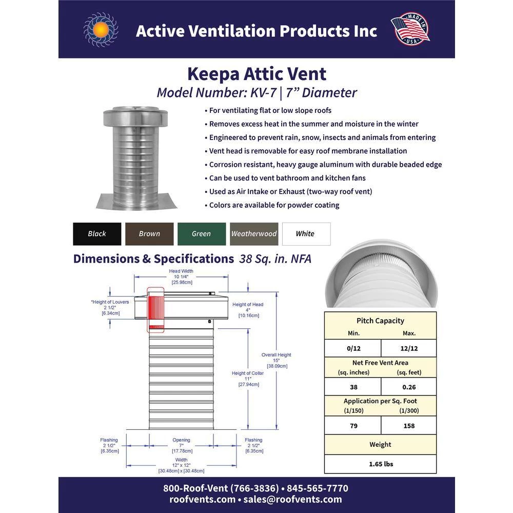 Active Ventilation Products Keepa Vent will alleviate moisture in the winter and heat in the summer to extend the life of the roof and building structure. The Keepa Vent is best used for flat roof attic spaces as an exhaust roof vent or fresh air supply intake roof vent. Made of corrosion resistant aluminum, the Keepa Vent has a round concentric vent cap and standard 11 in. collar height, square flange and an inner louver wildlife guard. The vent cap is a manufactured 1-piece spun round aluminum cap that prevents rain and snow from entering the vent. The vent cap is removable to allow access for an easy rubber boot installation for membrane roofs. The 11 in. standard collar is excellent for locations that accumulate high levels of snow falls and the round design is aerodynamic to with stand wind speeds up to 200 mph. The Keepa Vent has proven to be an excellent and economical choice for a flat roof application.