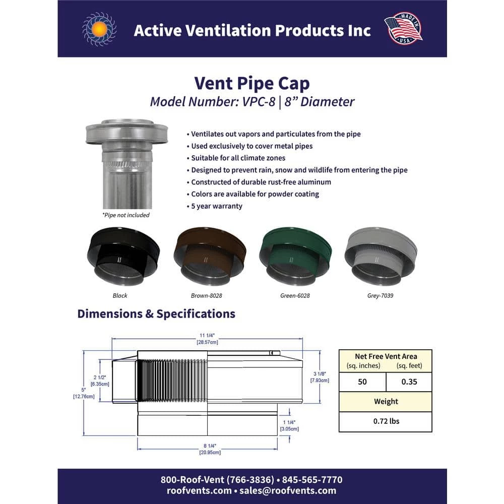 The Vent Cap covers metal pipes extending through the roof. AVP’s Vent Pipe Cap is constructed of durable, rust-free aluminum. These vent caps are not open to the sky, so they keep out rain, snow and debris. Not designed for PVC pipes.