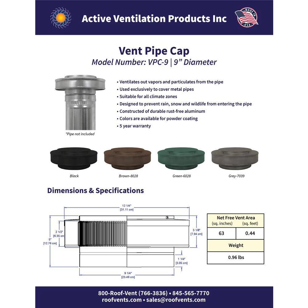 The Vent Cap covers metal pipes extending through the roof. AVP’s Vent Pipe Cap is constructed of durable, rust-free aluminum. These vent caps are not open to the sky, so they keep out rain, snow and debris. Not designed for PVC pipes.