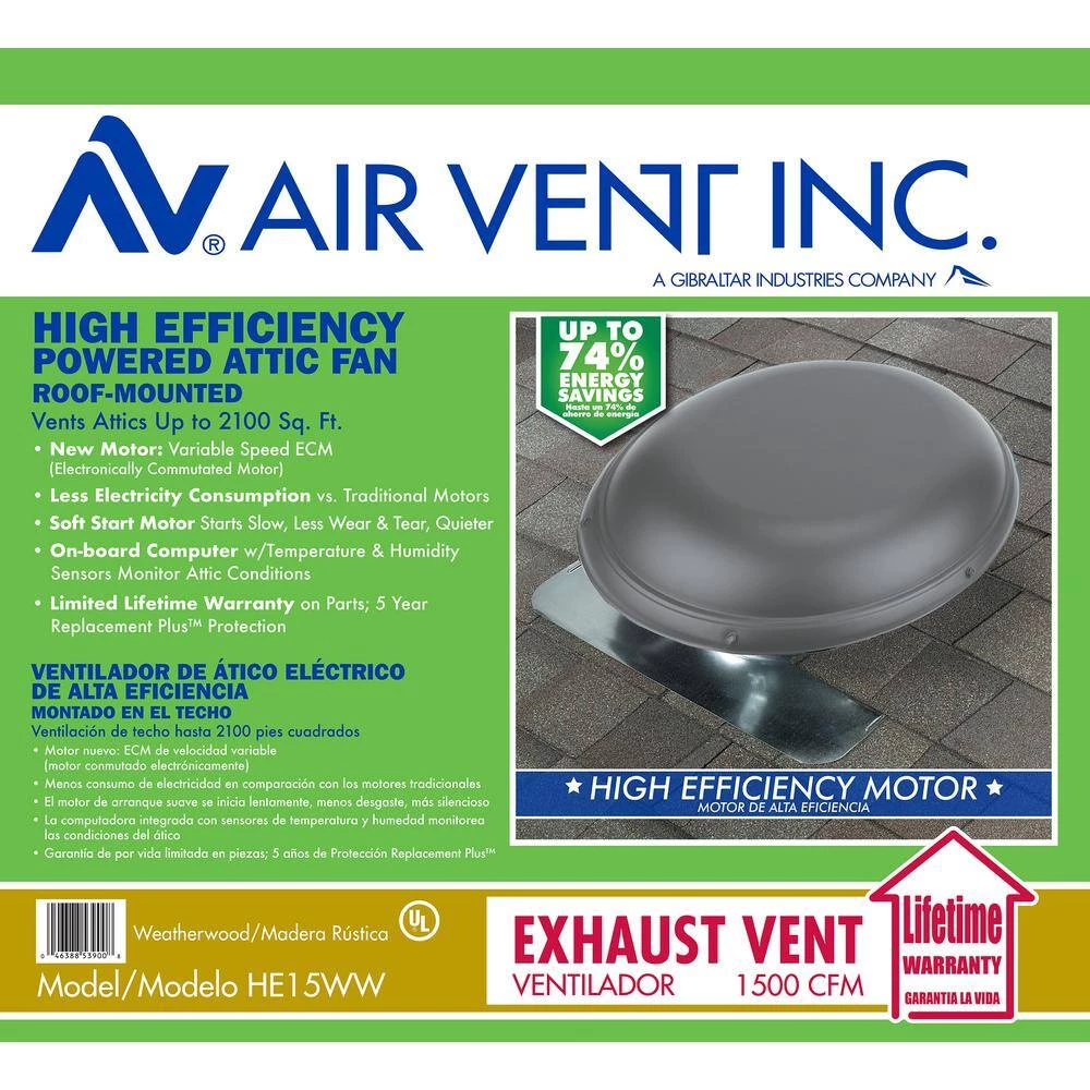 The High Efficiency powered attic ventilator comes with a ECM – Electronically Commutated Motor with an on-board computer to monitor and adjust to the temperature and humidity in the attic. The variable speed motor provides a quiet start up and reduces wear and tear on the motor while minimizing electricity consumption. On average, The HE15 consumes about $20 electricity costs annually; which is about $60 less per year compared to traditional power fan running 4 hours a day at average electricity costs. This is due to the unique motor and on-board computer that monitors and adjusts to the conditions in the attic. It features a low-profile dome, the power fan is unobtrusive when installed on the back side of your roof.