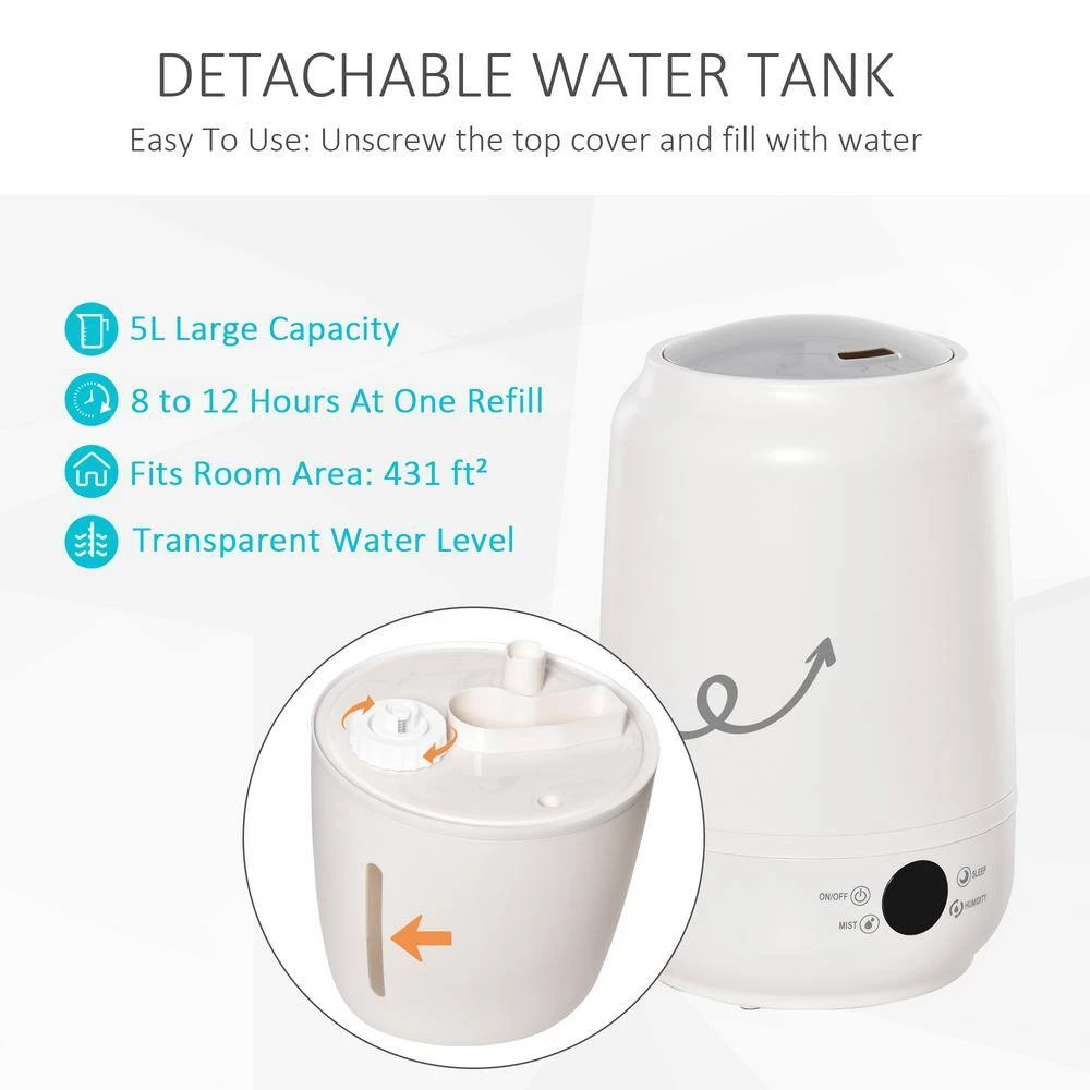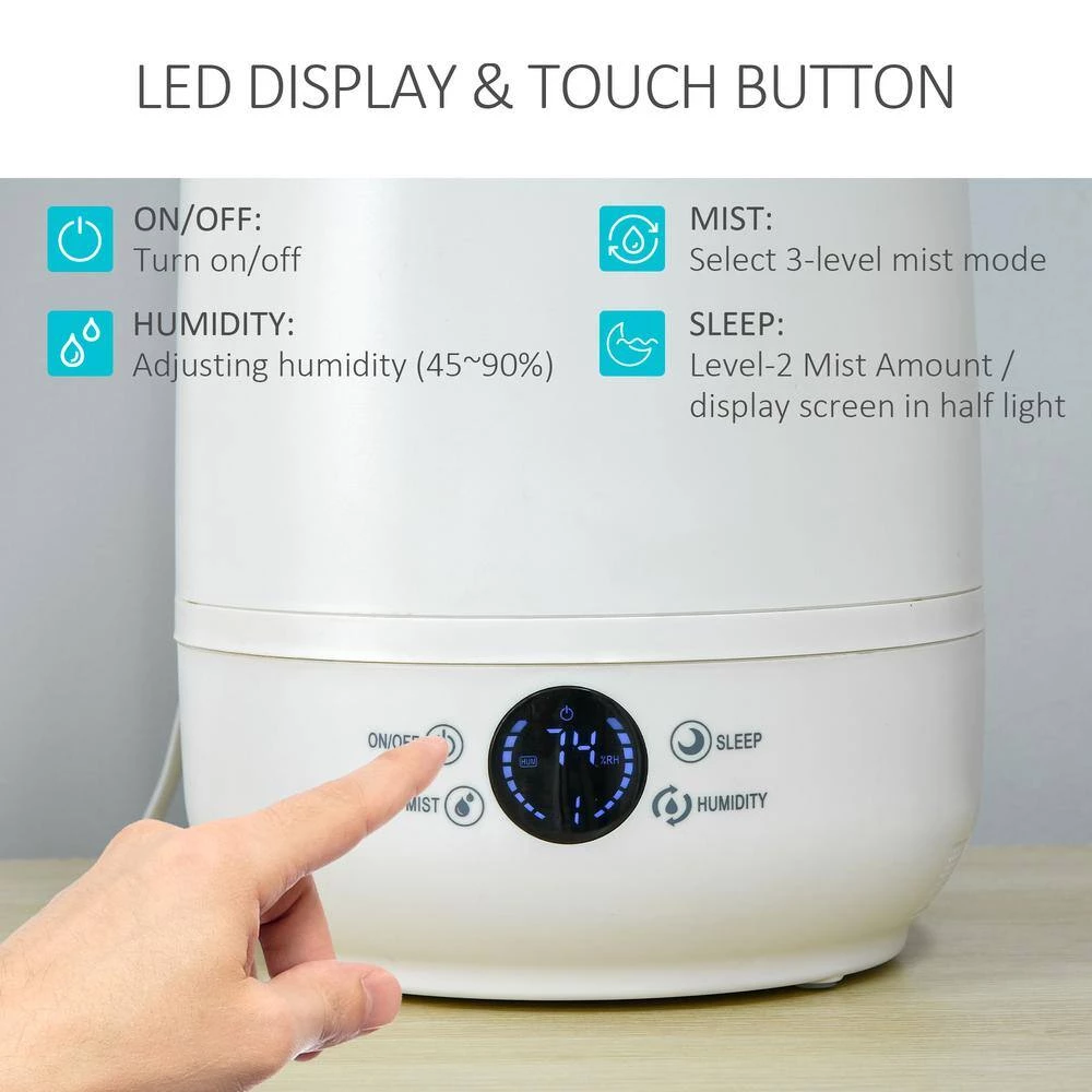 If you are looking for an essential humidifier, our HOMCOM humidifier will be a good choice. The cool mist humidifiers can store up to 5 l of water and work continuously for 8-hours to 12-hours. LED digital screen and touch button design for easy operation, you can clearly see the humidity and temperature. When the red light blinks, it tells you that you need to add water. Meanwhile, low noise design creates a quiet and comfortable environment without disturbing.
