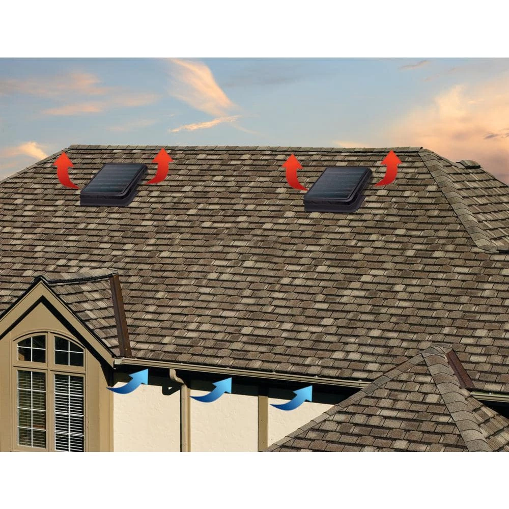 Breathe easier on a hot day with this Master Flow roof-mount exhaust fan. Made for attics up to 1,000 sq. ft., it offers an installed height of seven inches for a low-profile design. This fan automatically switches from solar to house power, and dual-power technology enables thermostat adjustment.