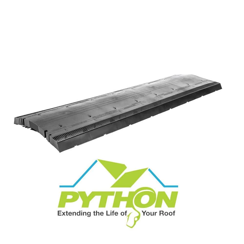 The most innovative, field-adjustable ridge vent on the market converts from 12 in. to 10 in. or 9 in. ridge vent by simply scoring the groove on the top of the vent. Made from durable, no-break polypropylene, it won’t rust or dent and closed external baffles make it less likely to collect debris resulting in diminished airflow. The patented PYTHON FlexFit 3-in-1 Ridge Vent is suitable for any roof pitch from 2/12 to 12/12 and provides a generous 84 sq. in. of Net Free Venting Area per piece. A vital piece for any shingled roof, the PYTHON FlexFit 3-in-1 Ridge Vent helps attics breath to keep cool and dry, reducing utility costs, preventing mold and mildew, extending shingle and roof-deck life, reducing air conditioning maintenance costs and eliminating damaging ice dams in winter months.